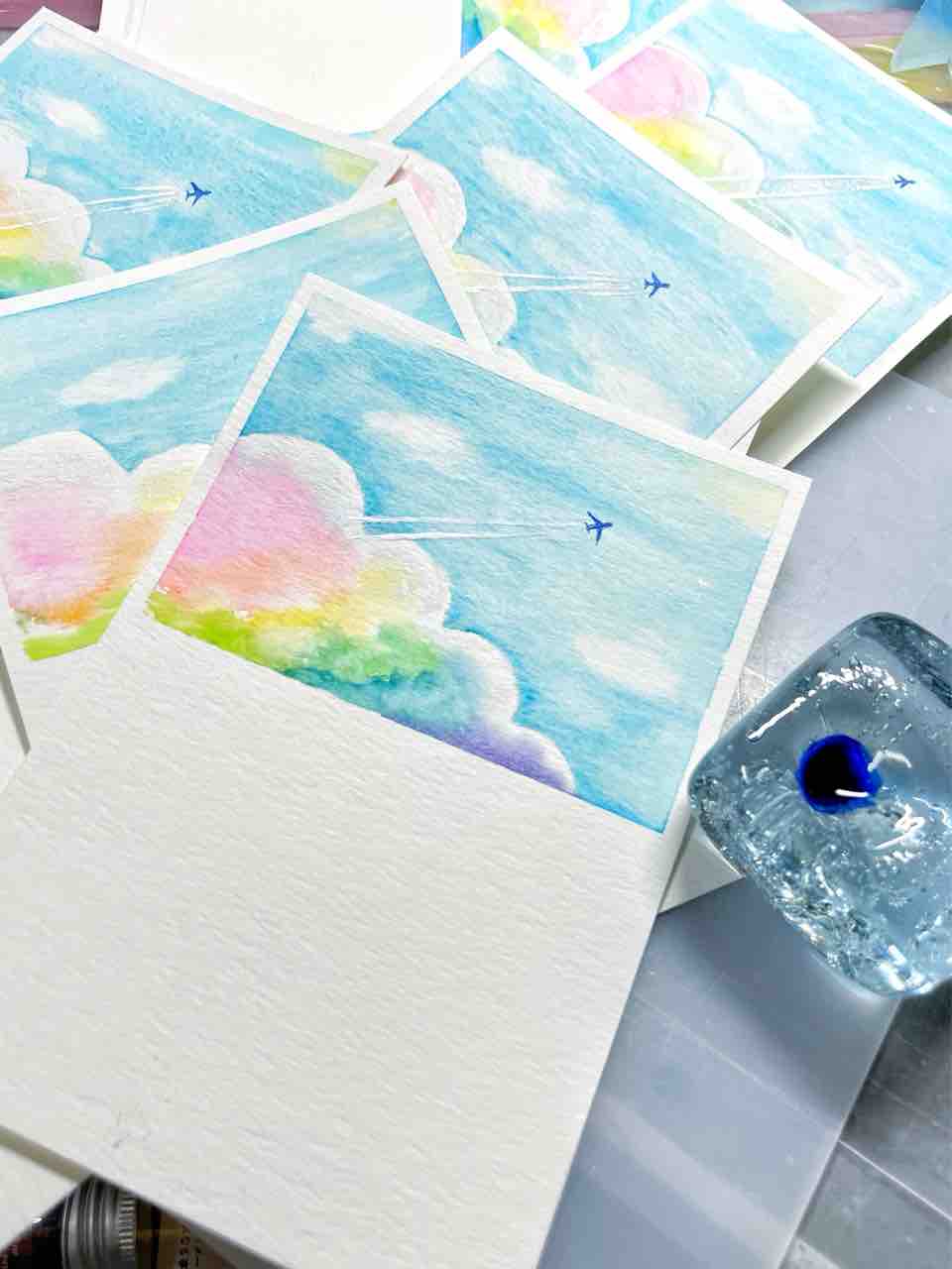 今回は知人が多かったし、やっぱり出したいなと図案?を考えていたら、DMで使ったひこうき雲プレートを思い出し、気づいたら絵を描いてた。