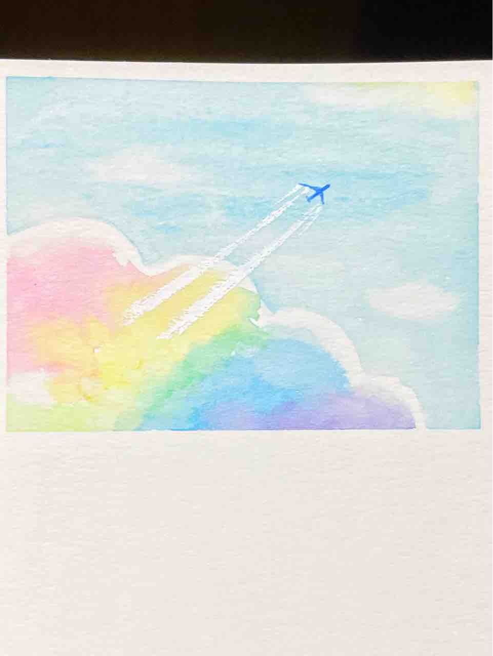 せっせと雲と空を描き、飛行機を、、、と筆で描くとなんだかどんくさい。