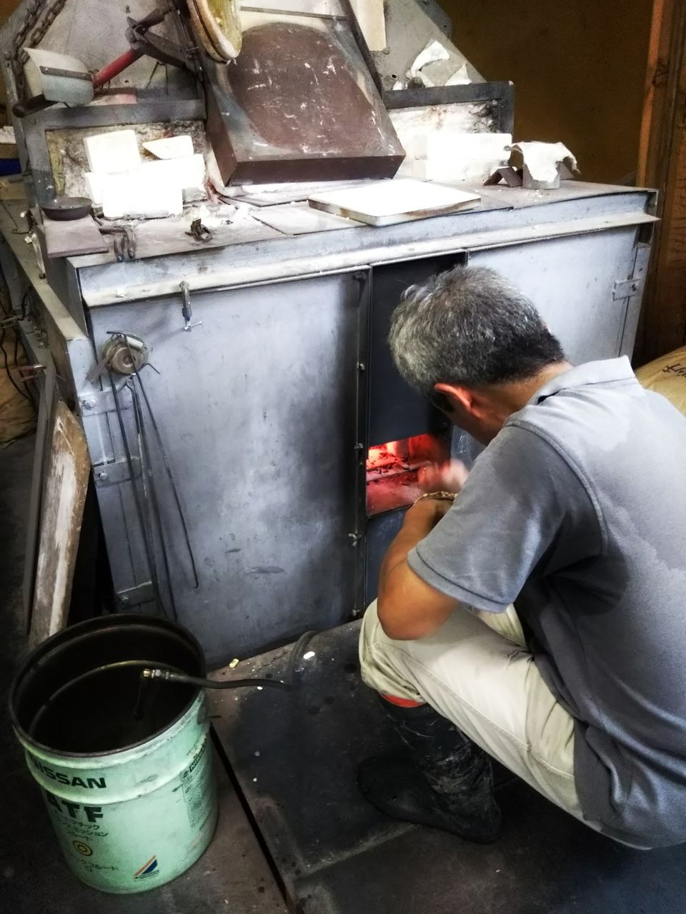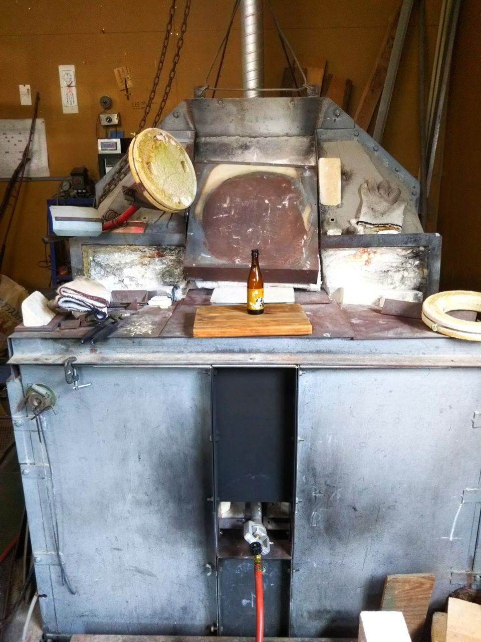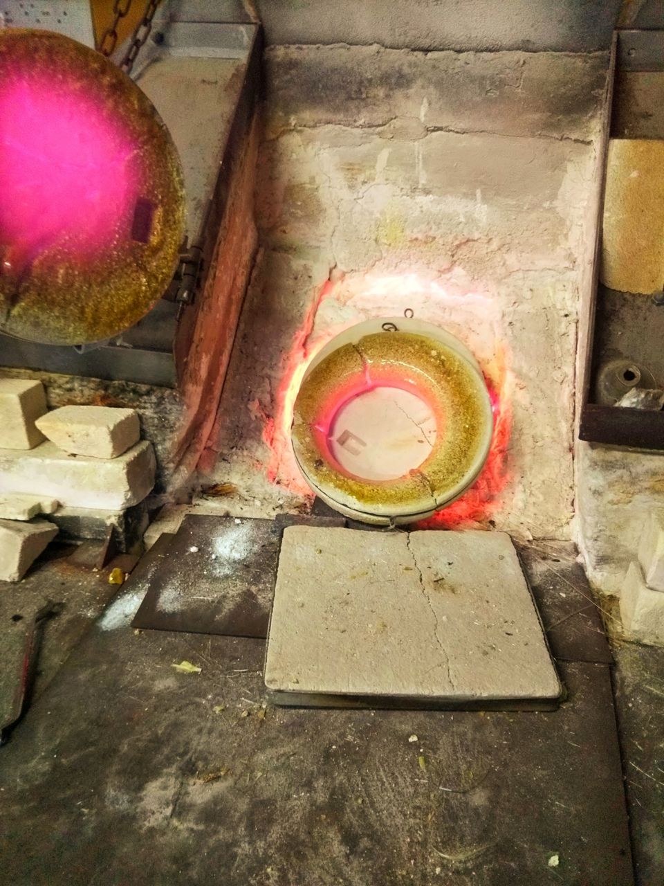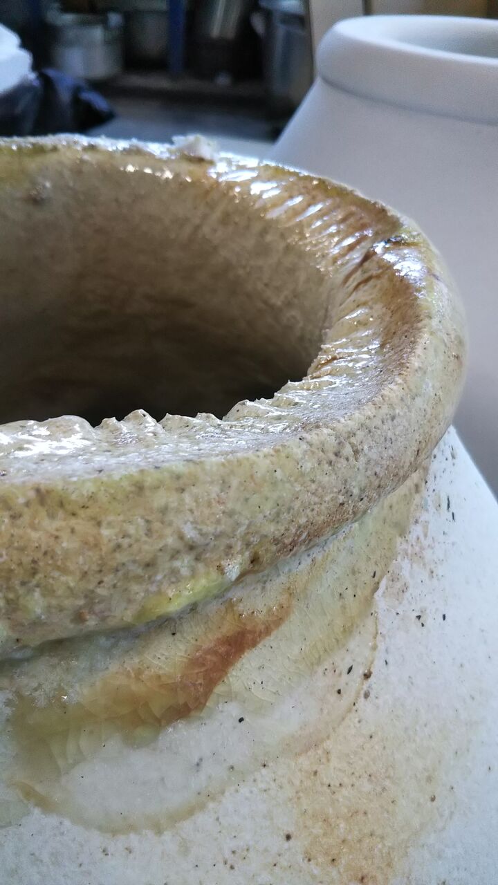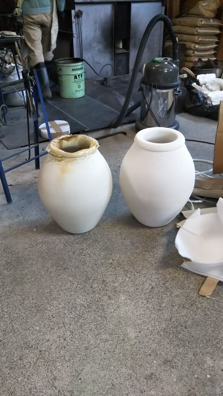 口元見ていただくと分かりますが、ガラスが坩堝をどんどん侵食して、いつか穴があいて溶解炉に垂れ流しになってしまうから