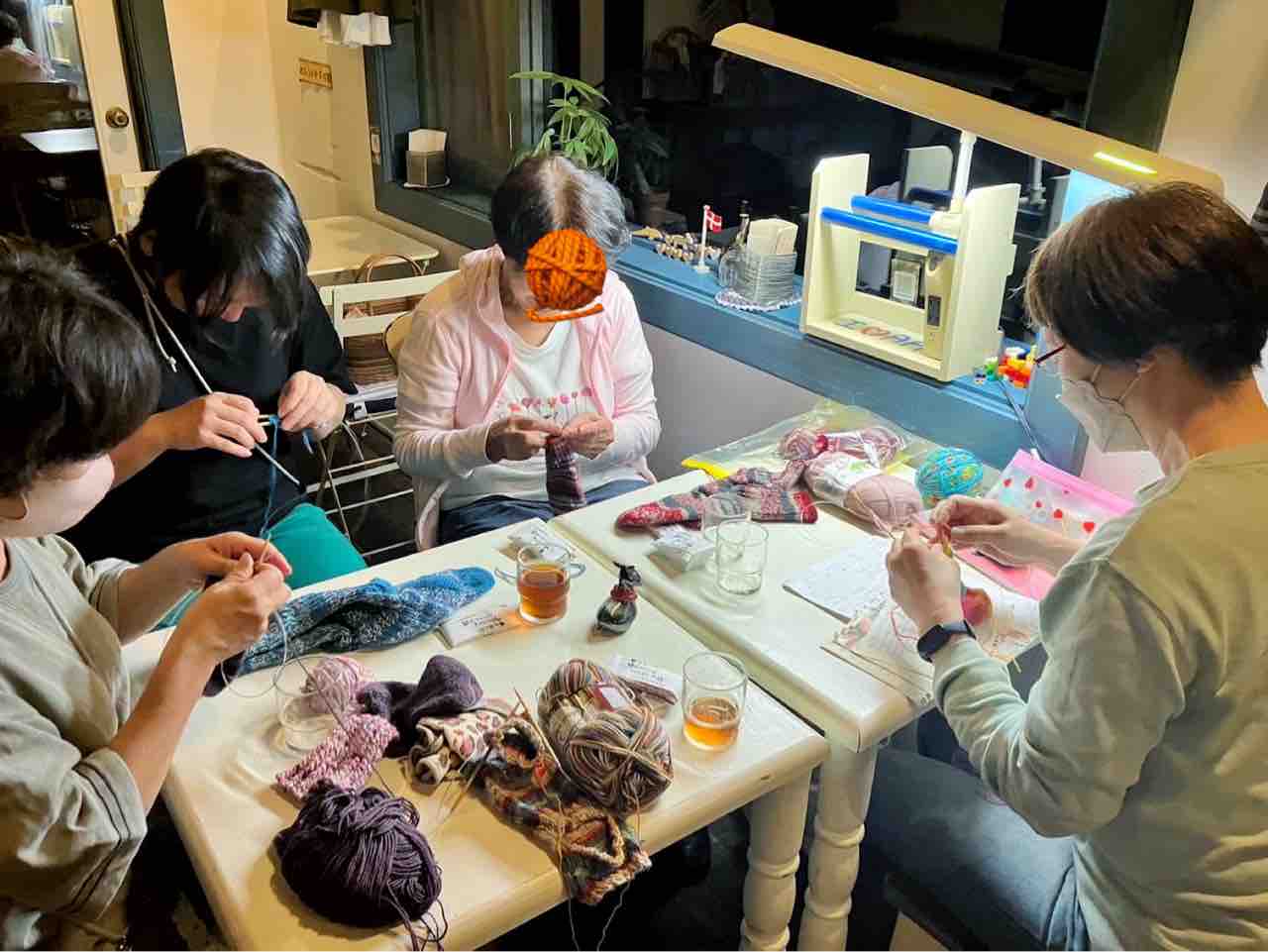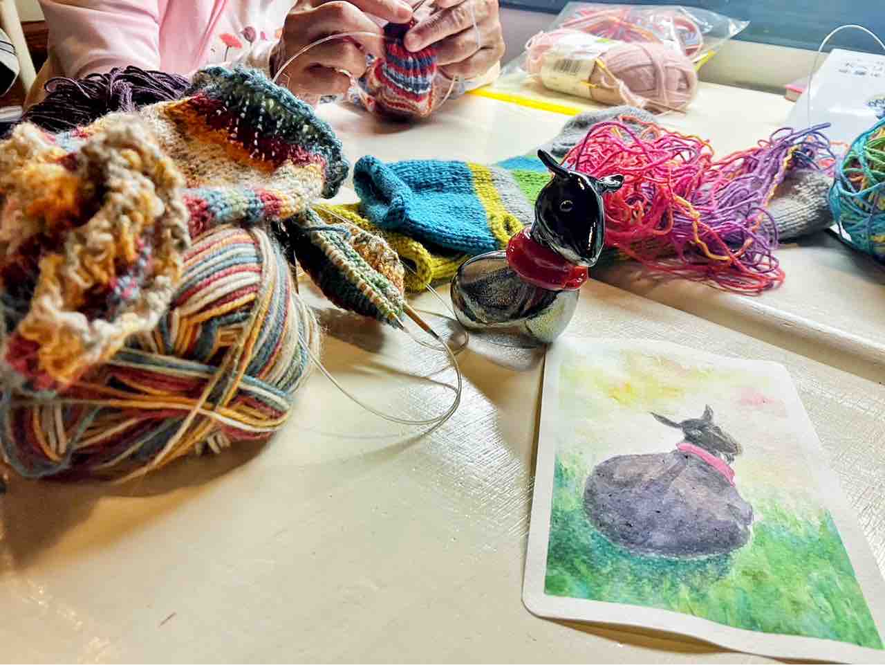 それから、ガラスのメエちゃんを囲みながら、皆さんと編み物。