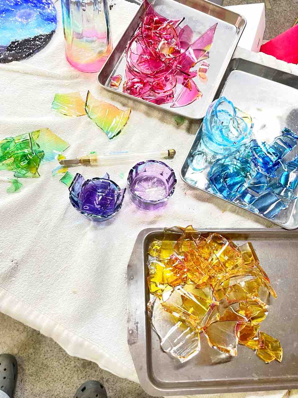 目に付いたガラスをとりあえず洗ってみて、拭いて、色別に割ってみました。