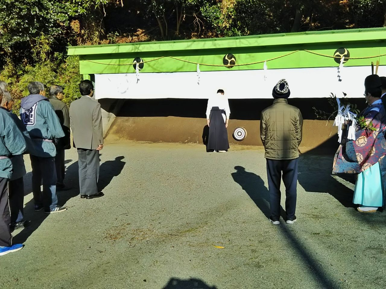 まず神事が行われ、神様に奉納された的を下ろして、支部長さんが射礼を行います。