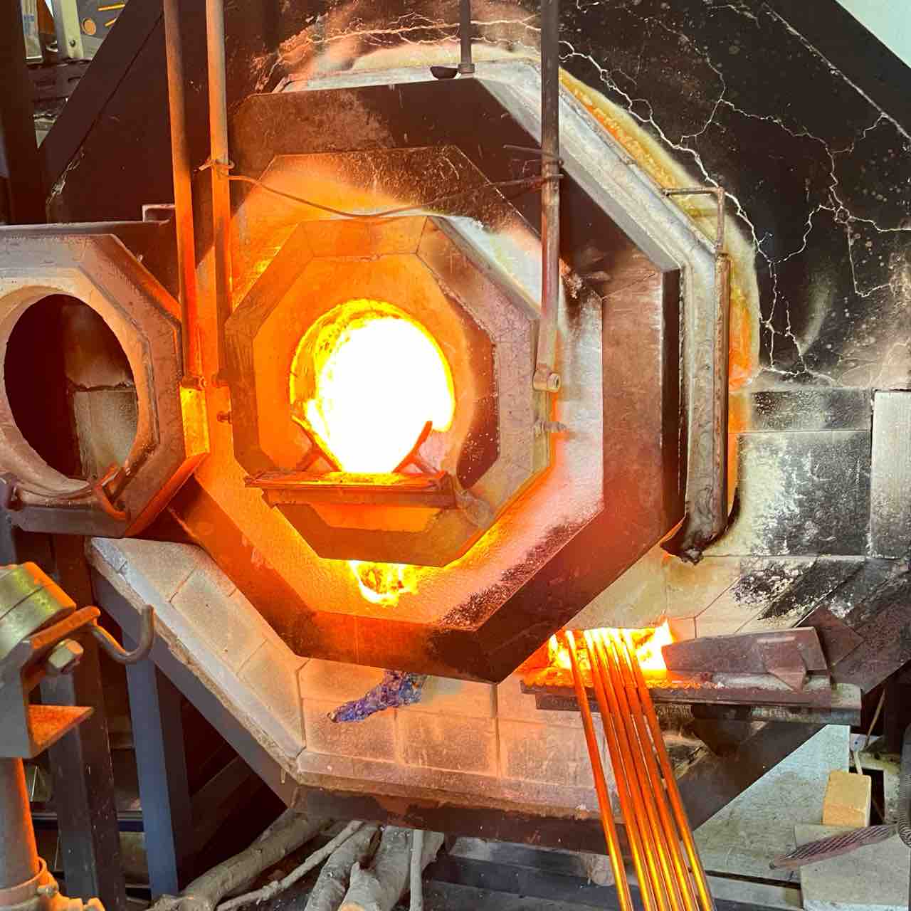 その温度で坩堝を焼締めて、原料を投入し、1晩かけて溶融したら制作開始です。