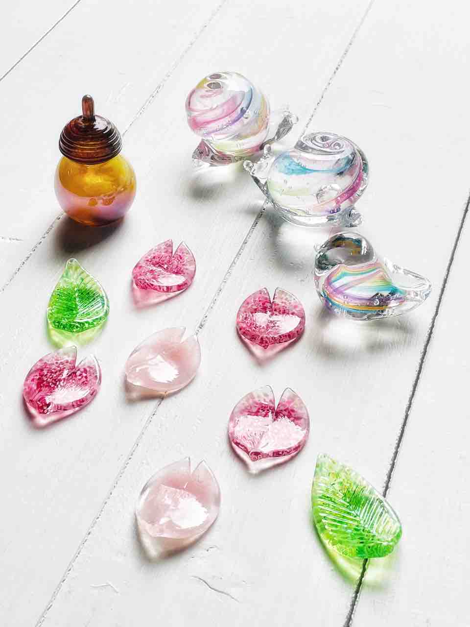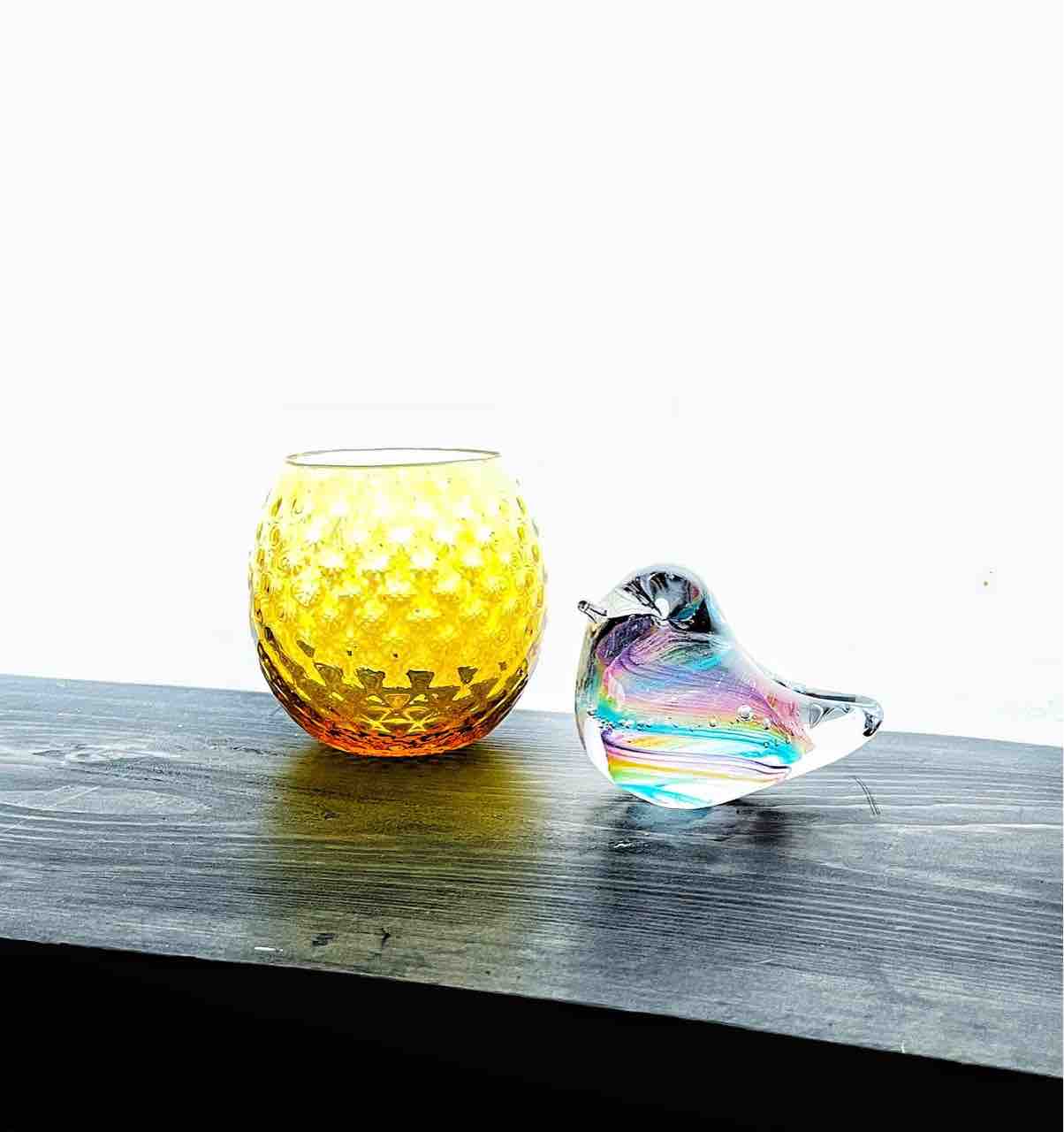ヨーヨーぐい呑み、グラス、ボウル、花入れ。虹色の小鳥シリーズ。